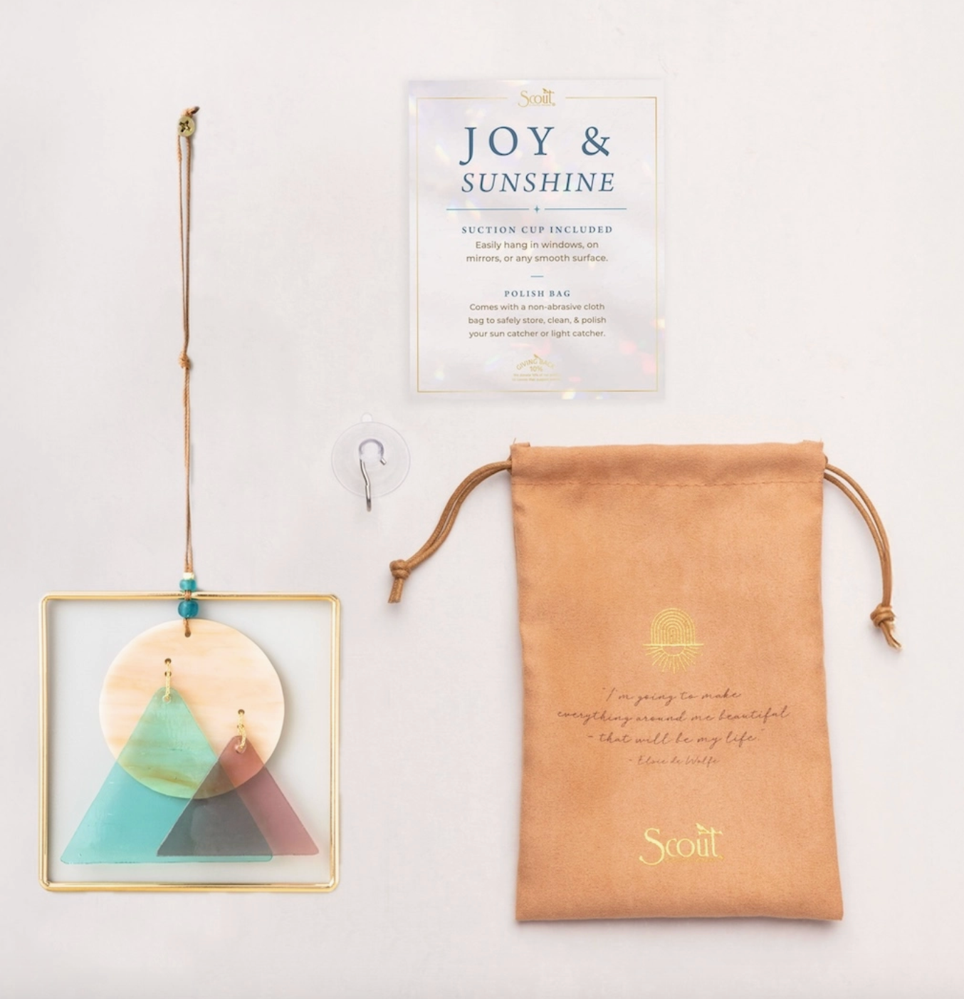 Thoughtfully designed to cast a magical glow, these luminous accents turn sunlight into a mesmerizing dance of color and light. Each piece of stained glass is hand cut and framed in graceful gold in one of four harmonious designs. The addition of glass and metal beads on the natural cord creates a thoughtful, layered accent. Every stained glass light catcher comes in a beautiful polish bag making it the perfect gift to create wonder from light.