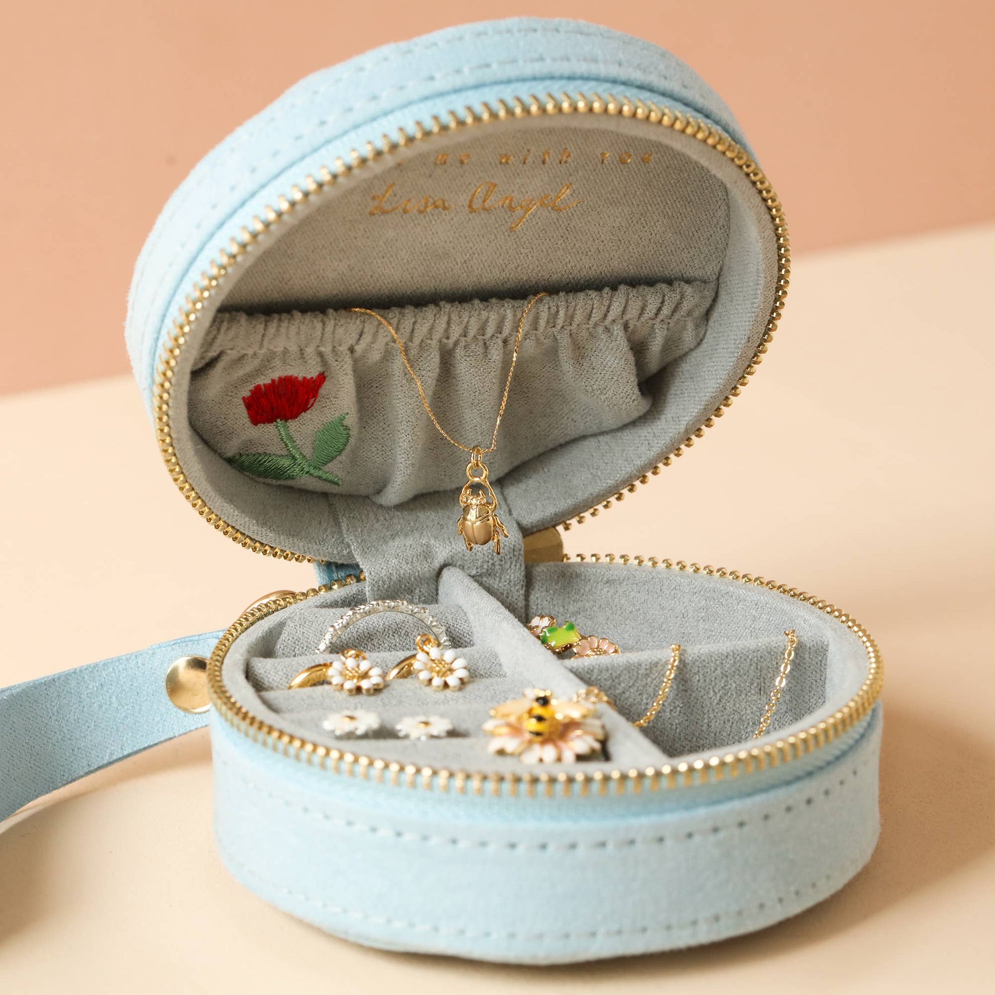 Embroidered Flowers Mini Round Velvet Jewelry Case