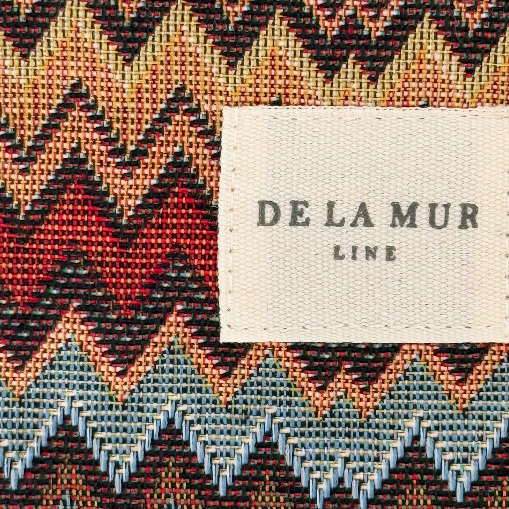 Eyewear case with zipper closure on top and a small beige cord handle on the side. Made from thick jacquard fabric with a multicolor zigzag pattern. Each piece may vary slightly depending on the fabric cut. Lined with thick grey fabric on the inside. Hand wash cold and do not tumble dry. Perfect for keeping your glasses safe. It has ample capacity.