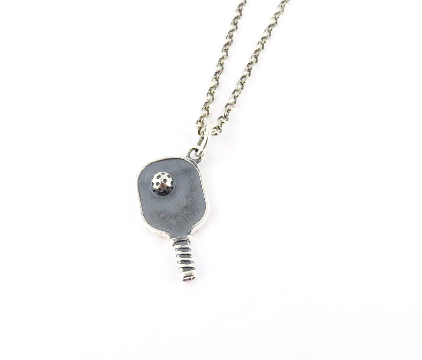 Cute sterling silver pickle ball racquet pendant on a sterling chain