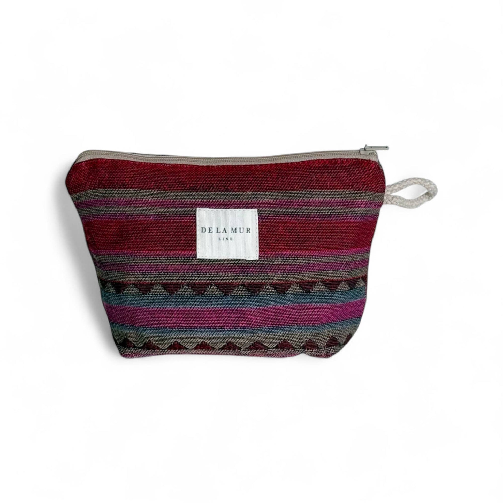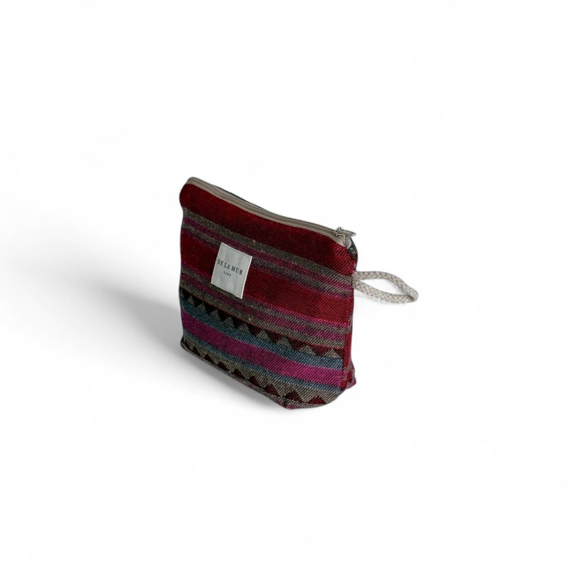 Small pouch with a zipper on top and a beige cord side handle. Made from thick jacquard fabric with a multicolor pattern. Each item may have variations in the pattern depending on where the fabric was cut. For proper care, wash in cold water and do not tumble dry. Ideal for storing anything, multipurpose and perfect for everyday use.